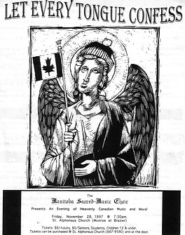 This poster was for the Inaugural Concert of the Manitoba Sacred-Music Choir. It contained repertoire for the choir's upcoming European Tour (May 1995), and members of both the Winnipeg Symphony Orchestra, and University of Manitoba School of Music's Orchestra Programme, in a performance of J.S. Bach's Cantata No. 80, A Mighty Fortress is Our God ("Ein feste Burg ist unser Gott"). Soloists for the cantata were Marni Enns, Soprano; Catherine Robbins, Alto; Craig Johnson, Tenor; and, Kevin Young, Bass; Tanis Kolisnyk, Organist; with guest artists Lori Jede, Flute, and Nicole Ens, Harpsichord. Albright Evangelical Church was a wonderful venue, and the leadership there graciously accommodating to fit in all the singers, orchestra, and audience! Much thanks to Darren Wall for the original poster art.